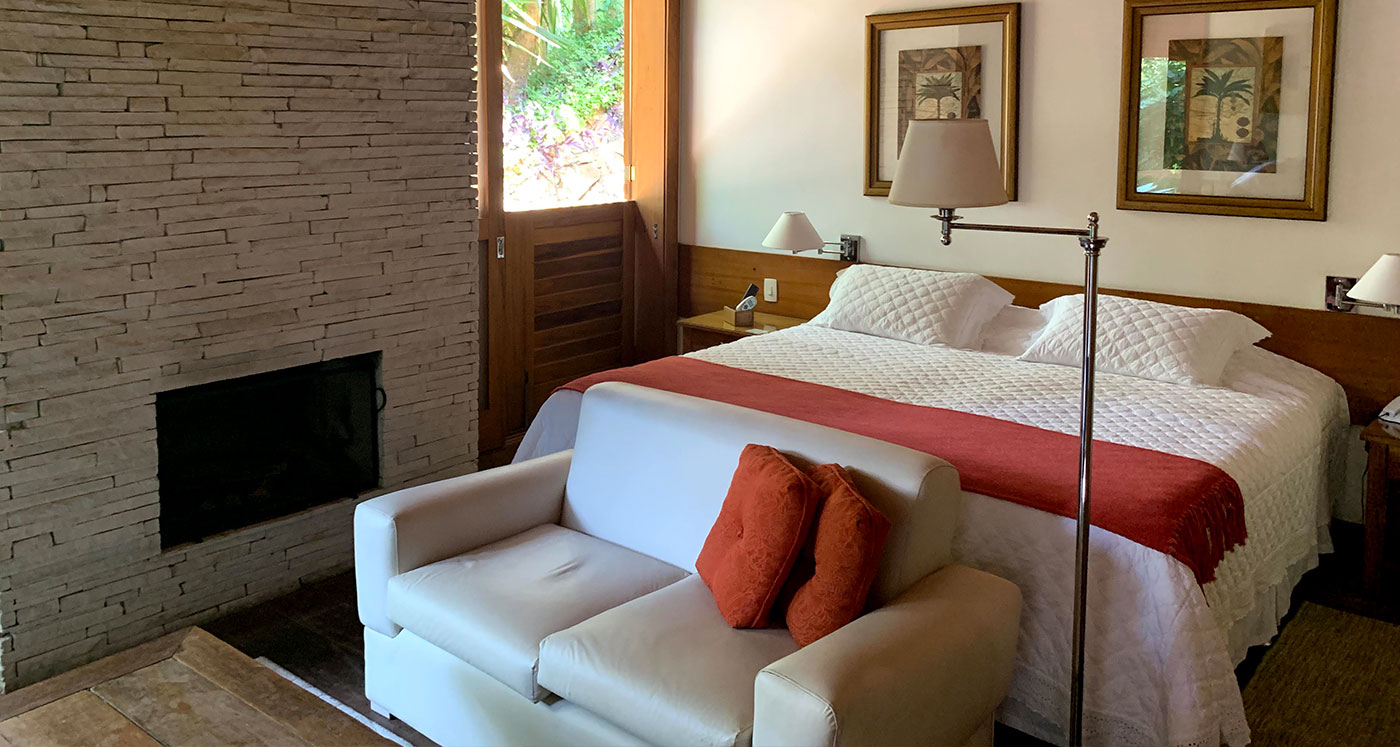 A acomodação conta com uma varanda privativa com vista para a piscina, perfeita para contemplar a paisagem e desfrutar de instantes de tranquilidade. Seu interior foi cuidadosamente equipado para garantir total conforto: cama King Size (ou opção com duas camas de solteiro), banheira de hidromassagem, lareira, frigobar, aquecedor de toalhas, máquina de café expresso, ar-condicionado, ventilador de teto, telefone, cofre digital, bancada de trabalho e armários planejados.